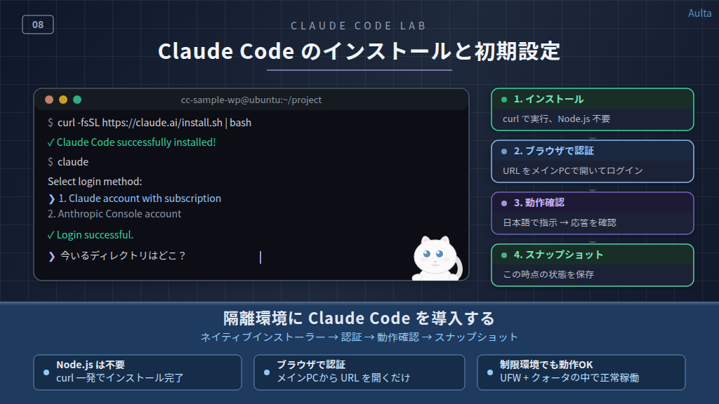 前回の記事までで、専用ユーザーの作成、SSH 強化、ファイアウォール設定、リソース制限が完了しました。この記事では、いよいよ Claude Code をインストールして動作確認を行います。