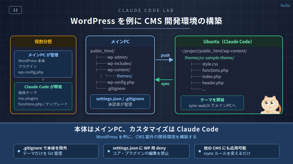 WordPress 本体やプラグインはメインPC側で管理し、カスタマイズ部分は Claude Code(Ubuntu 側)で開発するという役割分担です。