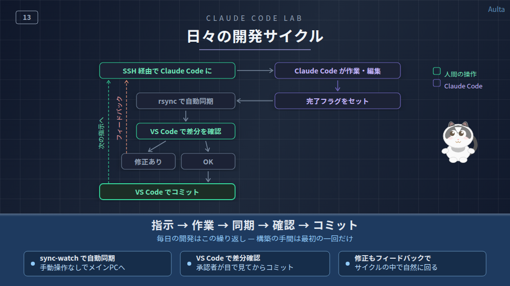 環境構築に比べると、日常の操作はとてもシンプルです。sync-watch を起動して、Claude Code に指示を出して、差分を確認してコミットする。これだけです。構築の手間は最初の一回だけで、毎日の開発は快適に回せます。
