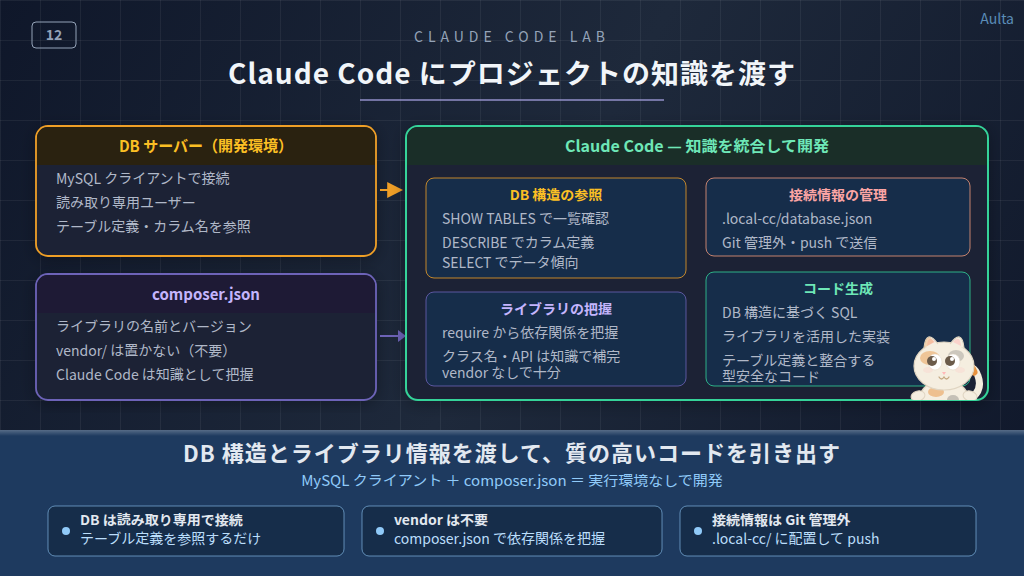 MySQL クライアントを導入して Claude Code が DB 構造を参照できるようにし、Composer プロジェクトで vendor を置かずに開発する考え方を整理します。