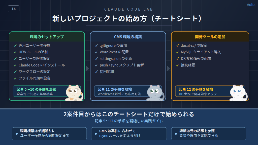 この記事は、記事5〜12の内容を要約したチートシートです。新しい案件が始まるたびに参照する手順書として使ってください。各手順の背景や詳しい説明は元の記事を参照してください。
