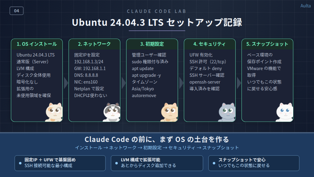 「Claude Code 導入の設計と方針」で整理した構成にもとづいて、まずはOSの土台を作るところから始めます。この記事では、Claude Code にはまだ触れません。まっさらな Ubuntu に最低限の設定を入れて、安全に次の工程へ進められる状態にするのがゴールです。