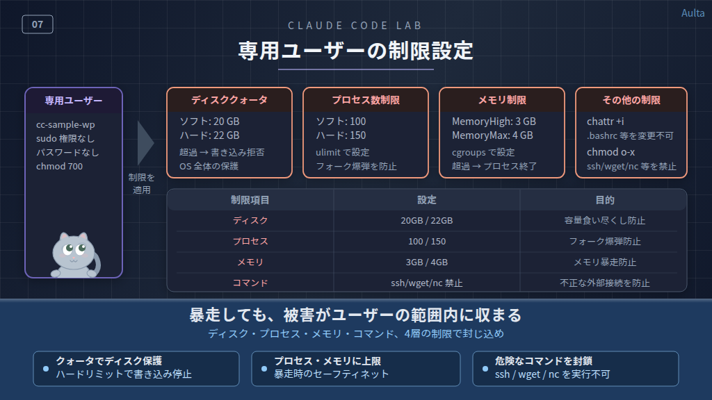 前回の記事で SSH の強化とファイアウォールの設定を行いました。この記事では、Claude Code 専用ユーザーに対してディスク・リソース・コマンドの制限を設定していきます。