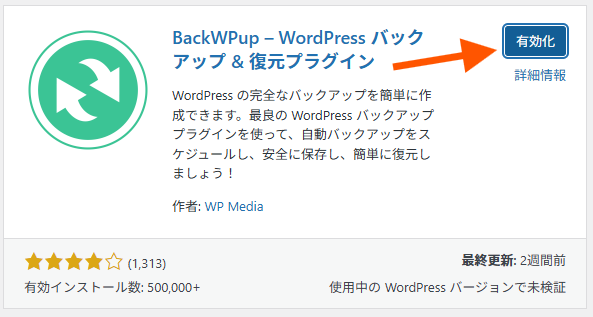 WordPress 管理画面から「プラグイン → 新規追加」を開きます。検索窓に「BackWPup」と入力し、正規のプラグインをインストールして有効化します。