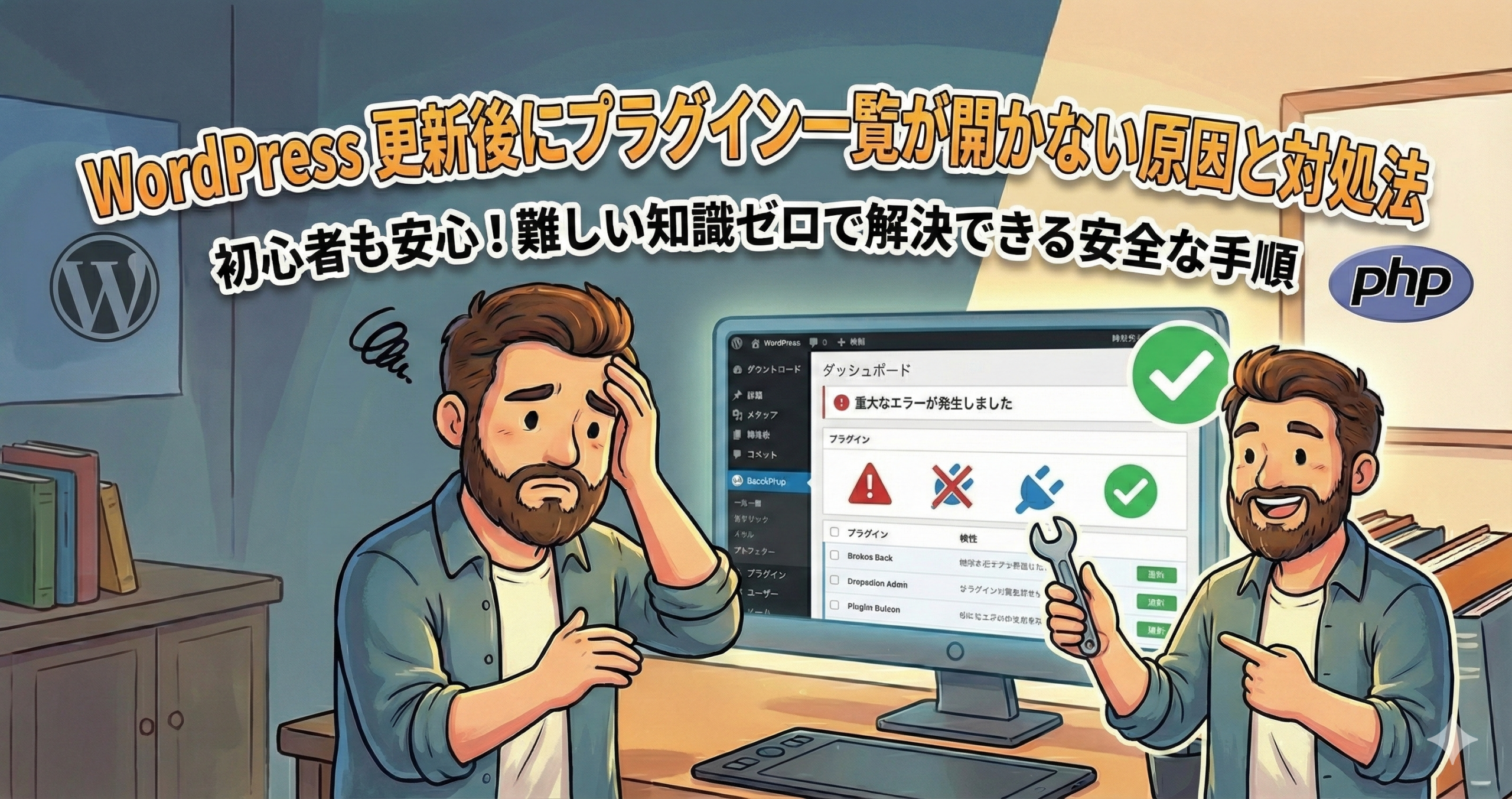 WordPress を更新した直後に、プラグイン一覧が突然開かなくなり「重大なエラー」が表示されることがあります。この現象はサイトの設定や操作ミスが原因ではなく、WordPress 本体と PHP の仕様が噛み合わないことで発生します。